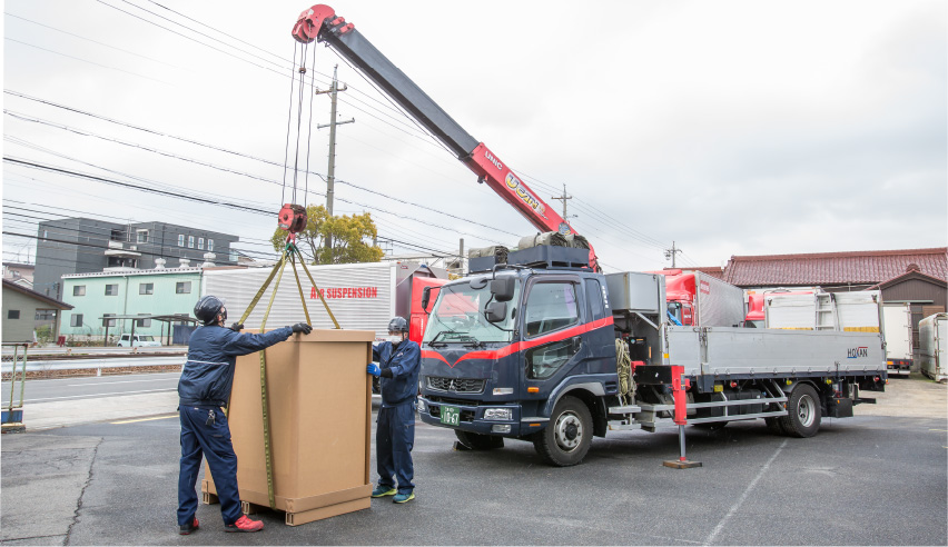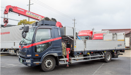 トラックとクレーン車の機能を併せ持った車輛です。精密機器の積み降ろし作業は大変な重労働で作業条件によっては危険も伴います。ユニック車であれば現場作業員の負担を大幅に削減でき効率よく積み降ろし作業が可能になります。また搬入現場の作業スペースが狭く、トラックとクレーンの2台が設置できない場合もユニック車があれば解決できます。当社ユニック車は精密機器輸送に必要なエアサスペンション・パワーゲートも装備しています。